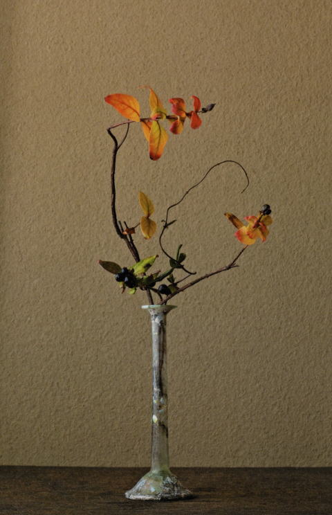 川瀬敏郎 Kawase Toshiro Official Homepage 冬を忍ぶ、という名が好きです。 冬にも青さを残すことから。 「四時之花」 花:忍冬、小坊主弟切草 器:ローマングラス瓶 ローマ時代 (C) 川瀬敏郎事務所 All rights reserved.